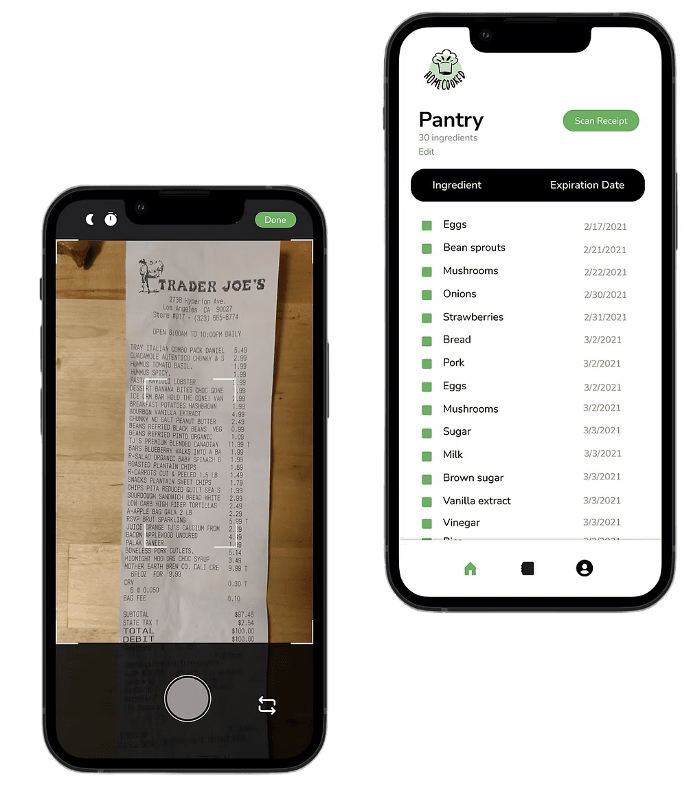 We know it can be hard to update ingredients all the time. HomeCooked has a scanning feature where users can take a picture of their receipt and the ingredients are automatically inputted into the pantry.
