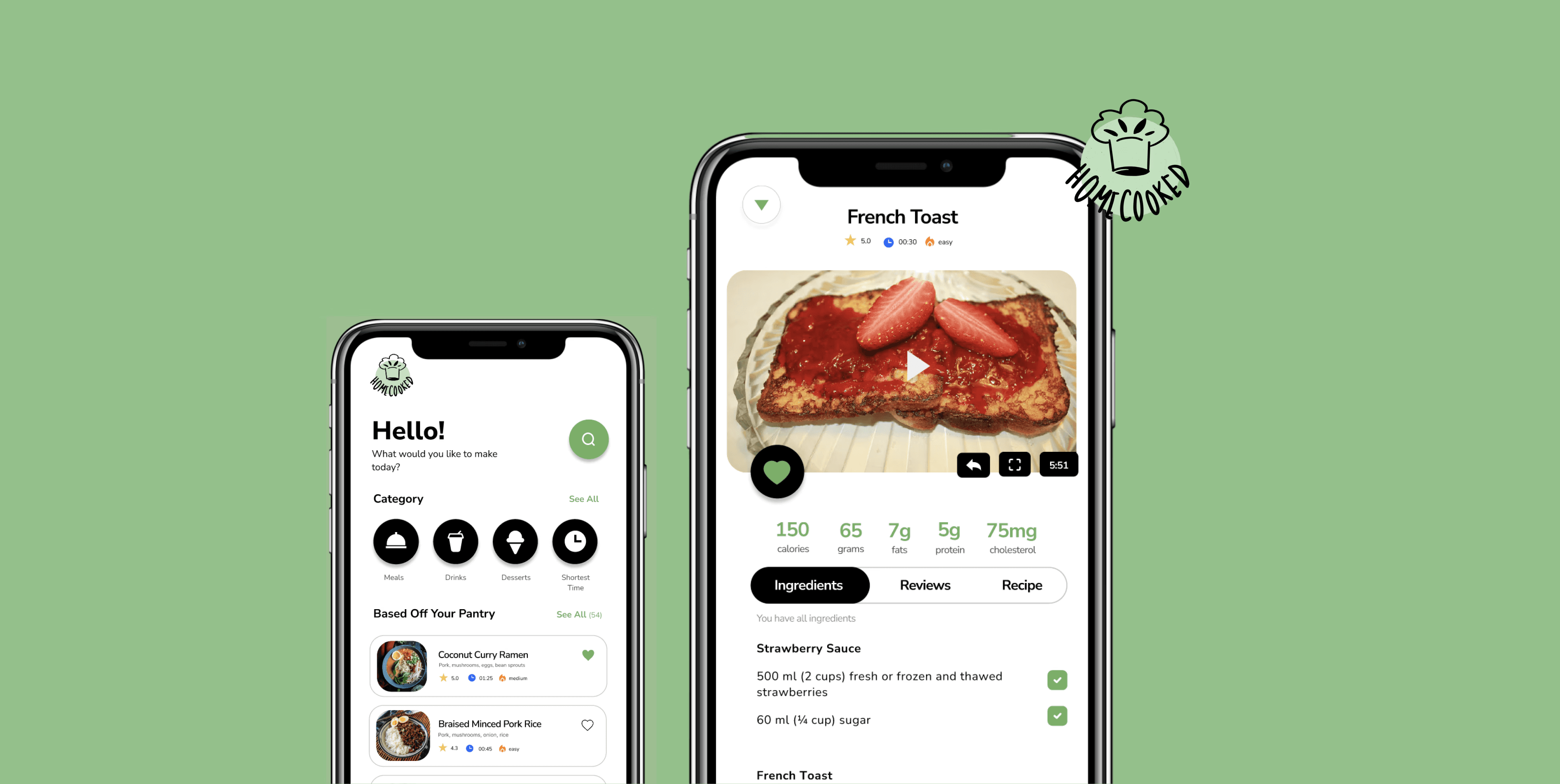 Based off the ingredients that users have in their pantry and the closest expiration dates, HomeCooked produces tailored recipes that help users find things to cook quickly, easily, and without waste.