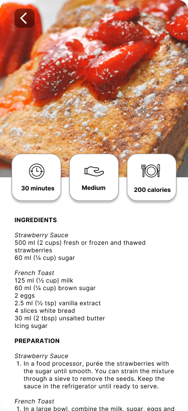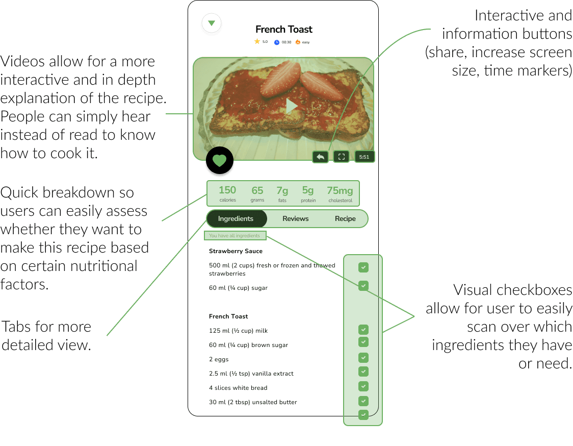 To reduce the load and questions that users have to decide what to cook and eat, each recipe has a collection of information to help guide their decisions.