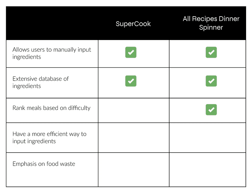 Our overall idea was to create an application that goes hand in hand with the cooking process -- creating an easy and sustainable method for the cooking experience. We started creating features, but realized that there might be other competitors in the market who have these ideas. So, we decided to conduct another brief competitive analysis to best improve our application: