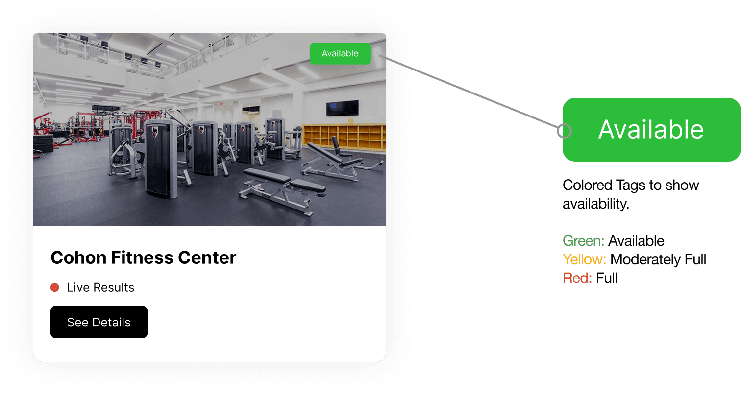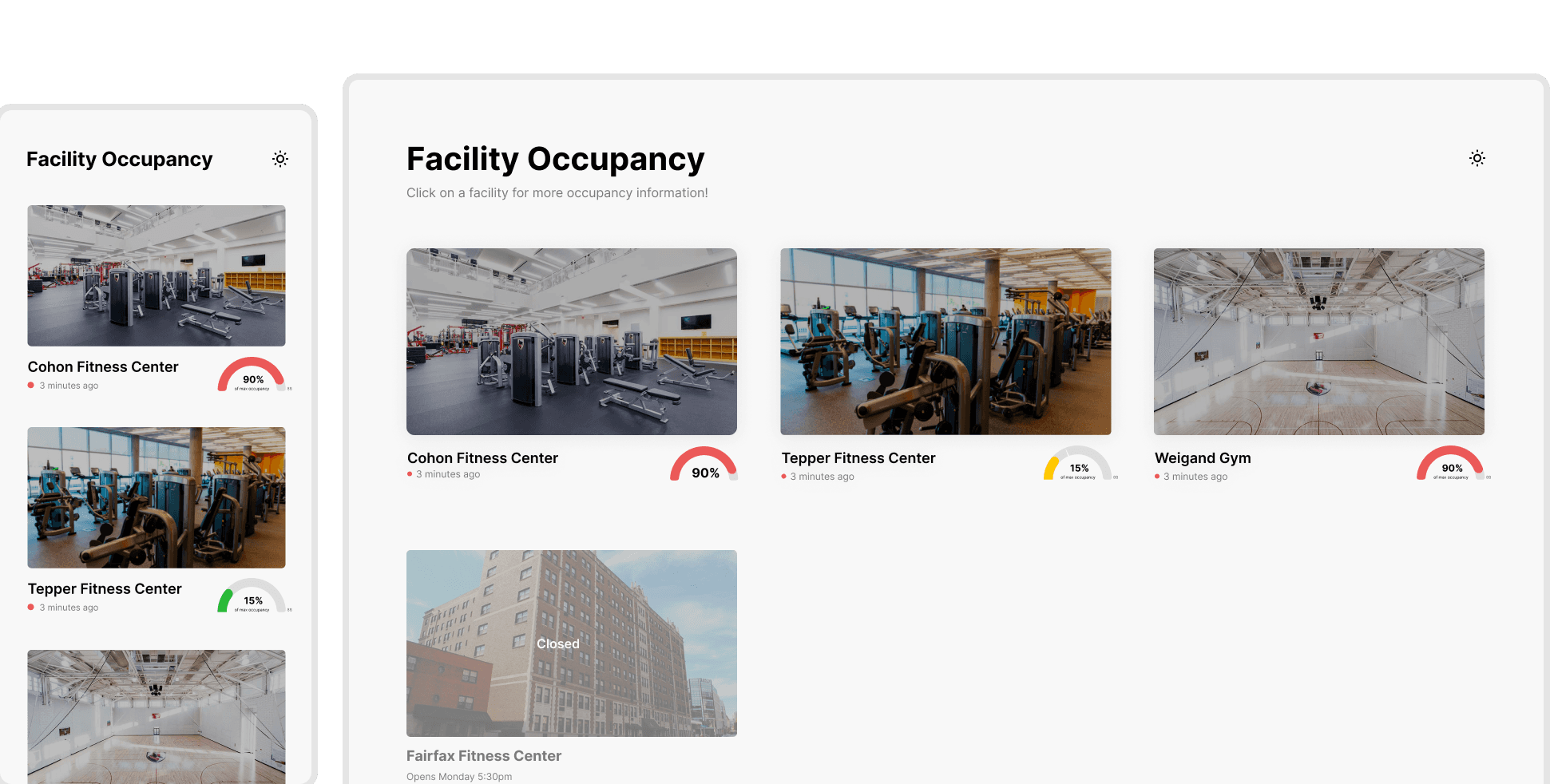 A color-coded meter that gives students an immediate snapshot of how busy each campus gym is. Students can quickly decide whether to go now or plan for a less crowded time without needing to interpret numbers or charts.