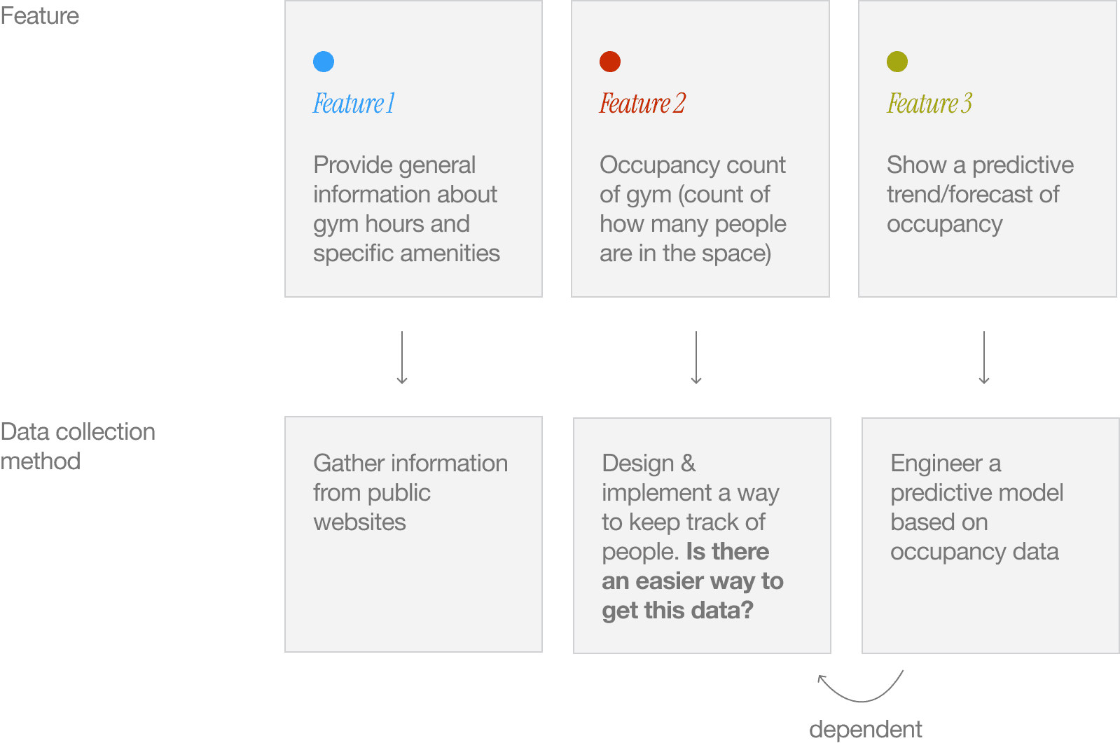 Feature 1 relied on data that could be gathered from public websites, while Feature 3 depended on access to the data required for Feature 2. Rather than implementing our own tracking system, we wanted to explore existing ways to obtain accurate data on how many people were entering and leaving the gym.