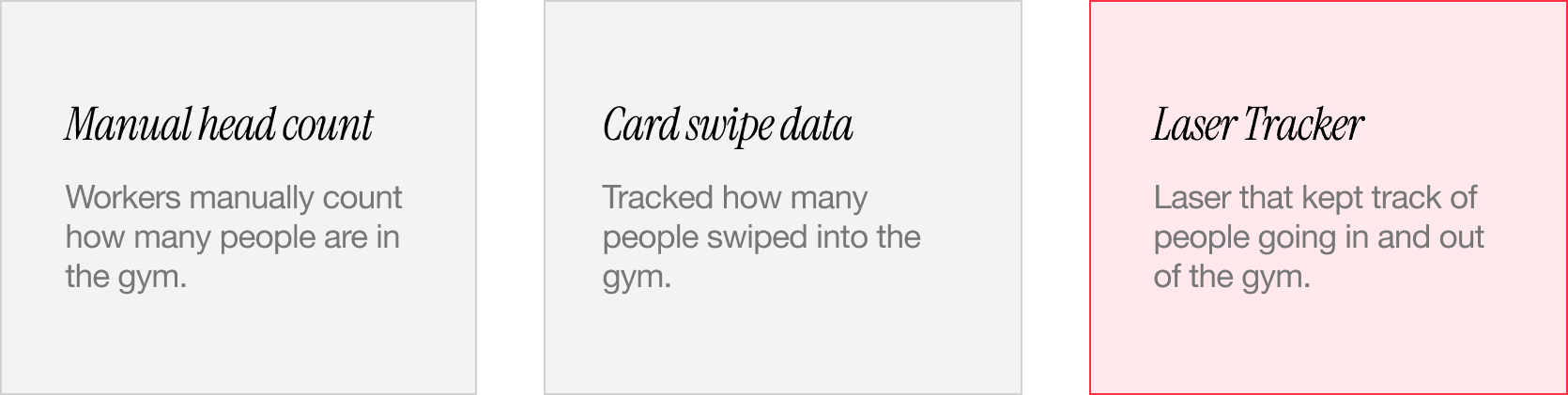 So, we engineered a third data stream: a physical laser tracker that counted people entering and leaving the gym in real time.