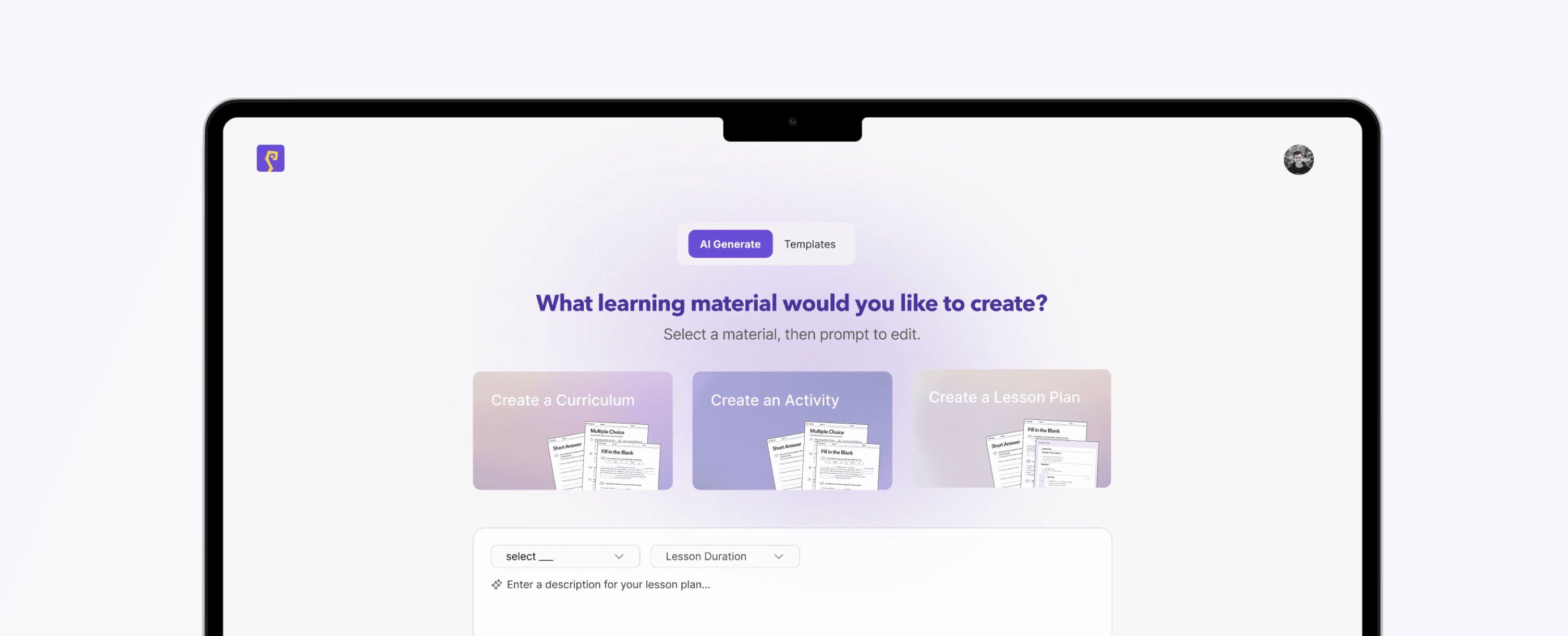Teachers can begin prompting with anything or choose from templates, They can also select a type of material, so for example lesson plans or worksheets to ground their experience.