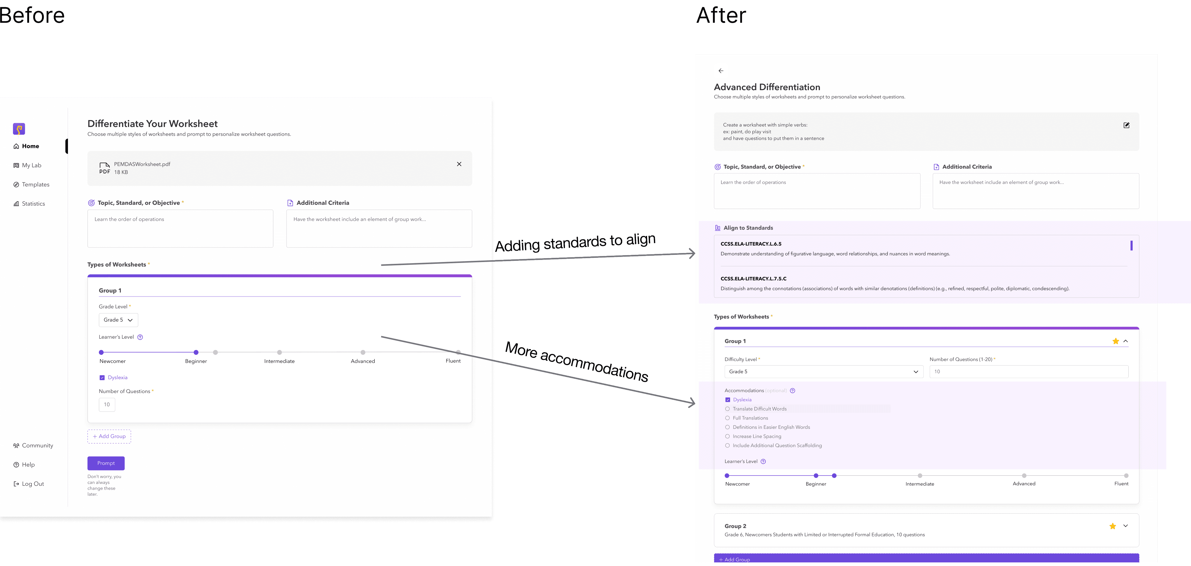 The differentiation button on the landing chat page takes them to this advanced differentiation page if teachers want to focus in on differentiating materials. Here, their saved Groups with specific accommodations are already autofilled, and the teacher can edit if needed.