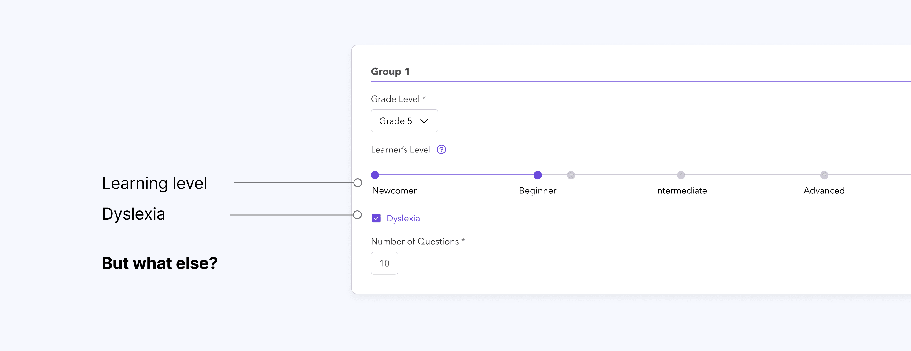 We initially designed out the interface to be just a hypothesis of what we assumed teachers wanted personalization for -- maybe teachers wanted adjustments in learning level and dyslexia accommodations. But we really weren’t sure about these criteria. So we went back to teachers and asked: