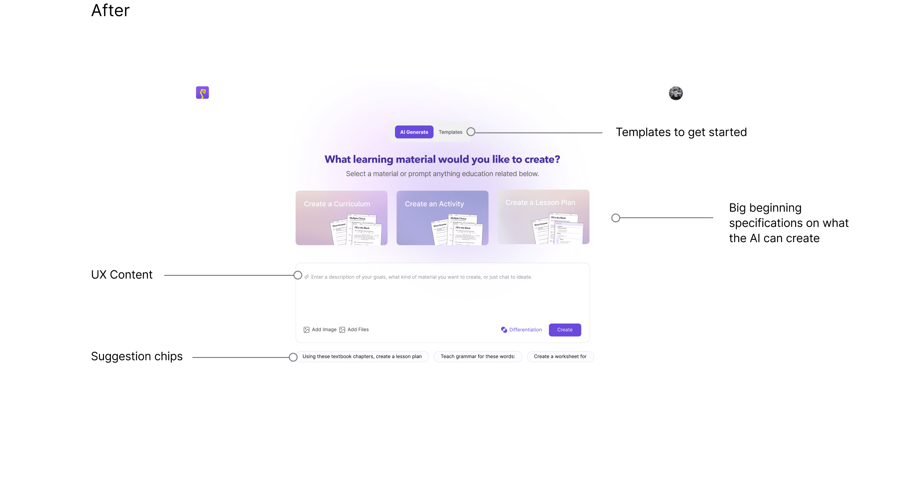 Our initial approach was to build a template library. The reason why we started with this idea was because we heard from many of our teachers that a huge chunk of differentiation comes down to giving different students different materials, and finding the right worksheets to match each student's learning goals takes up more time than it should.